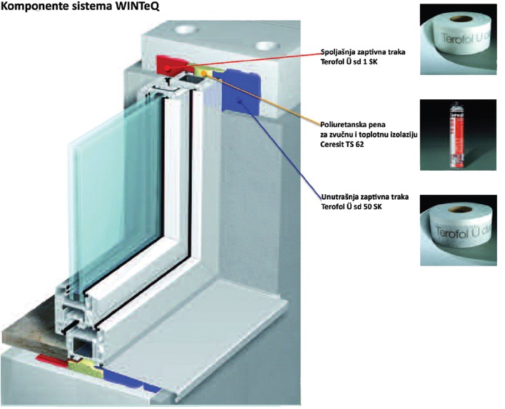 Unutrašnja zaptivna traka-Terofol Ü sd 50 SK jednostavno se nanosi na unutrašnju stranu prozorskog rama zahvaljujući lepljivom delu trake. Posebna struktura trake omogućava ujedno difuziju pare i vetropropusnost. Preko trake se može obradjivati malterom ili lepkom. Poliuretanska pena za zvučnu i toplotnu izolaziju-Ceresit TS 62 Ispunjava prostor-fugu izmedju prozorskog rama i zida-gradjevine. Brizganjem iz pištolja pena se širi manje od 30%, stvrdnjava za 60min. i grantuje zvučnu i toplotnu izolaciju. Spoljašnja zaptivna traka- Terofol Ü sd 1 SK , jednostavno se nanosi na spoljašnju stranu prozorskog rama zahvaljujući lepljivom delu trake. Posebna struktura trake omogućava ujedno vodootpornost od kiše i parnopropusnost. Preko nje se može odradjivati malterom ili lepkom. Elastična masa za zaptivanje i lepljenje- Ceresit FT 101 Jednostavno se nanosi pomoću pištolja za kartuše. Omogućava lepljenje između zaptivnih traka i zida-gradjevine; trajno je elastična, otporna na kišu i može se farbati. |